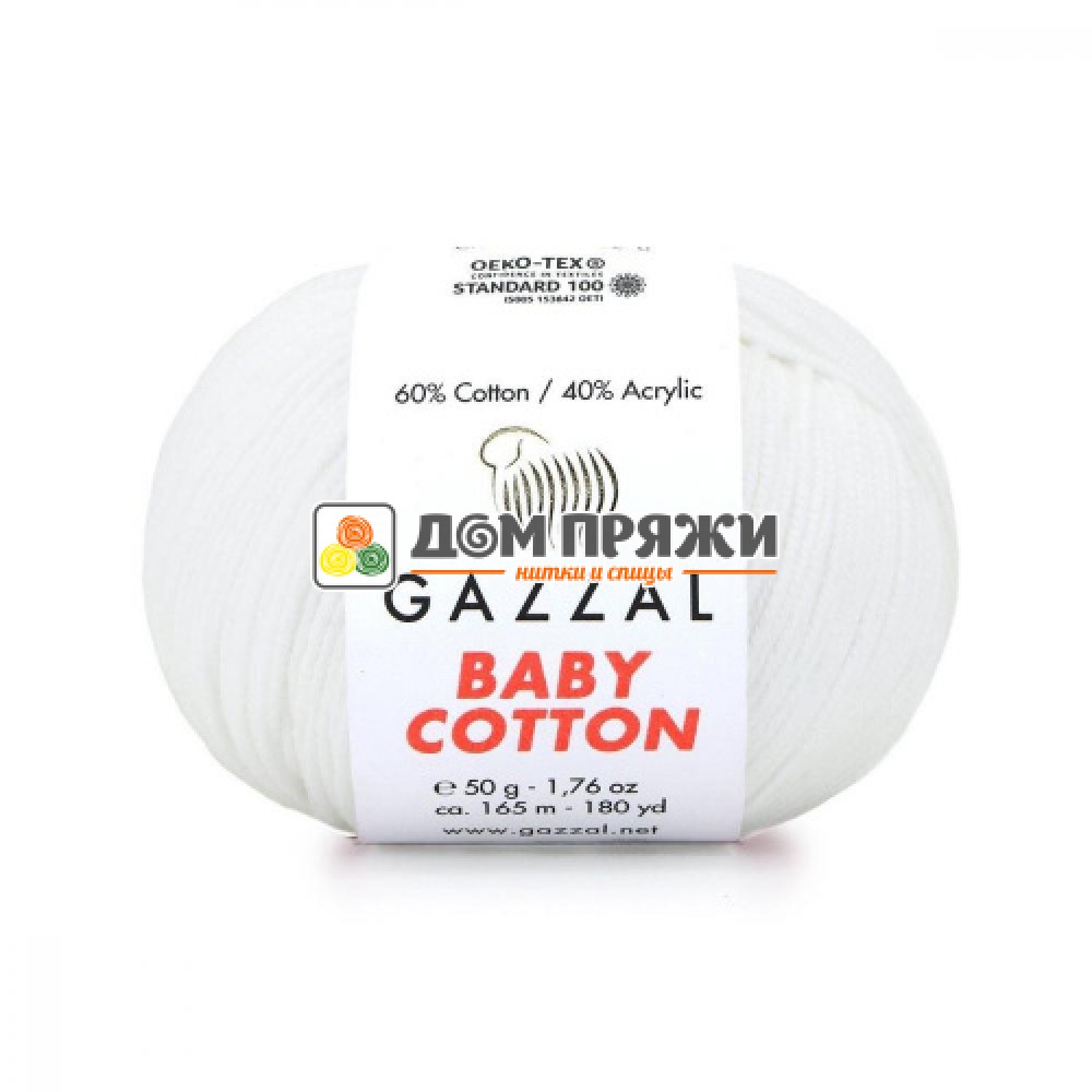 Пряжа Gazzal Baby Cotton #3432 отбелка. Состав: 60% хлопок 40% акрил. Размер спиц: 3,0 - 4,0мм. Размер крючка: 2,0 - 3,0мм. Метраж: 165м.Вес: 50гр.